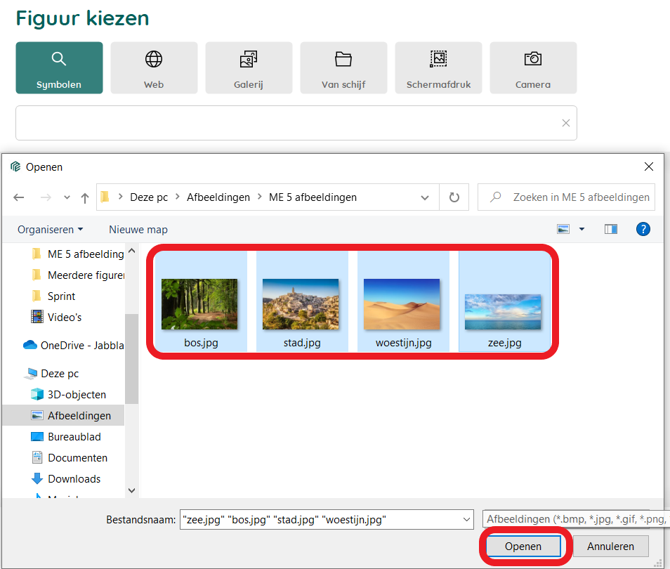 6. Selecteer de gewenste afbeeldingen. Gebruik eventueel sneltoetsen (Shift of Ctrl), als je meerdere afbeeldingen tegelijk wil importeren in je ME-document. Klik vervolgens op “Openen”.